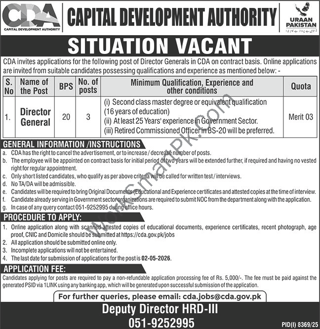 Keywords: CDA Islamabad Jobs 2026, Capital Development Authority Vacancies, Director General BPS-20 Jobs, Apply Online CDA Jobs, P.O Box CDA Islamabad, Govt Jobs 2026.